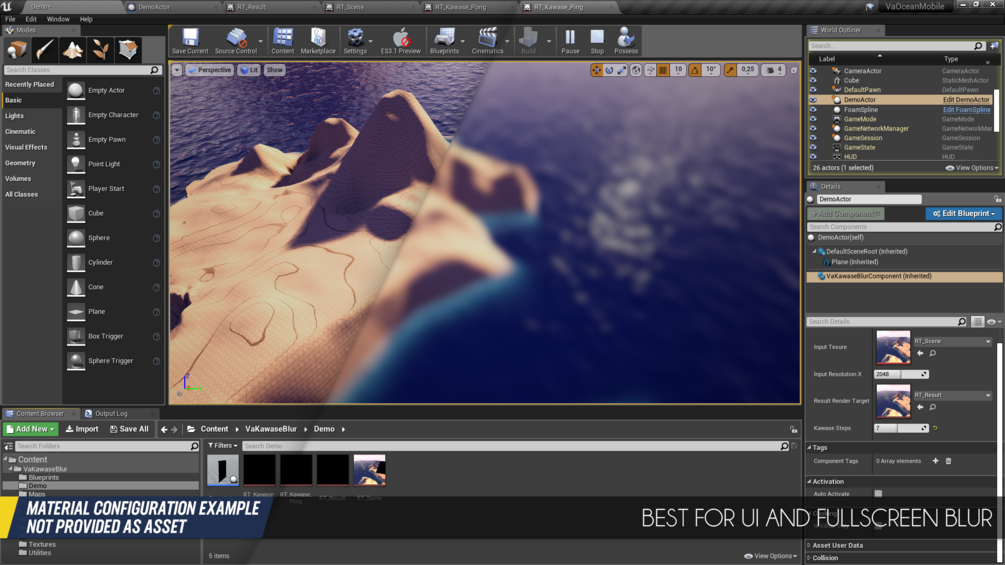 VaKawaseBlur is a blueprint controlled material shader that realizes multipass blur algorythm based on Kawase paperworks. It requires much less texture samples than classic gaussian approach and works really fast.
